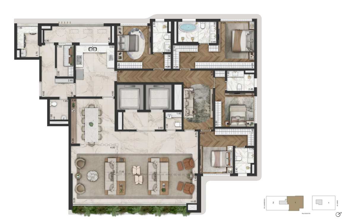 Implantado em um terreno exclusivo com tripla frente, o projeto oferece mais privacidade, iluminação natural e valorização, um diferencial raro mesmo entre imóveis de luxo.